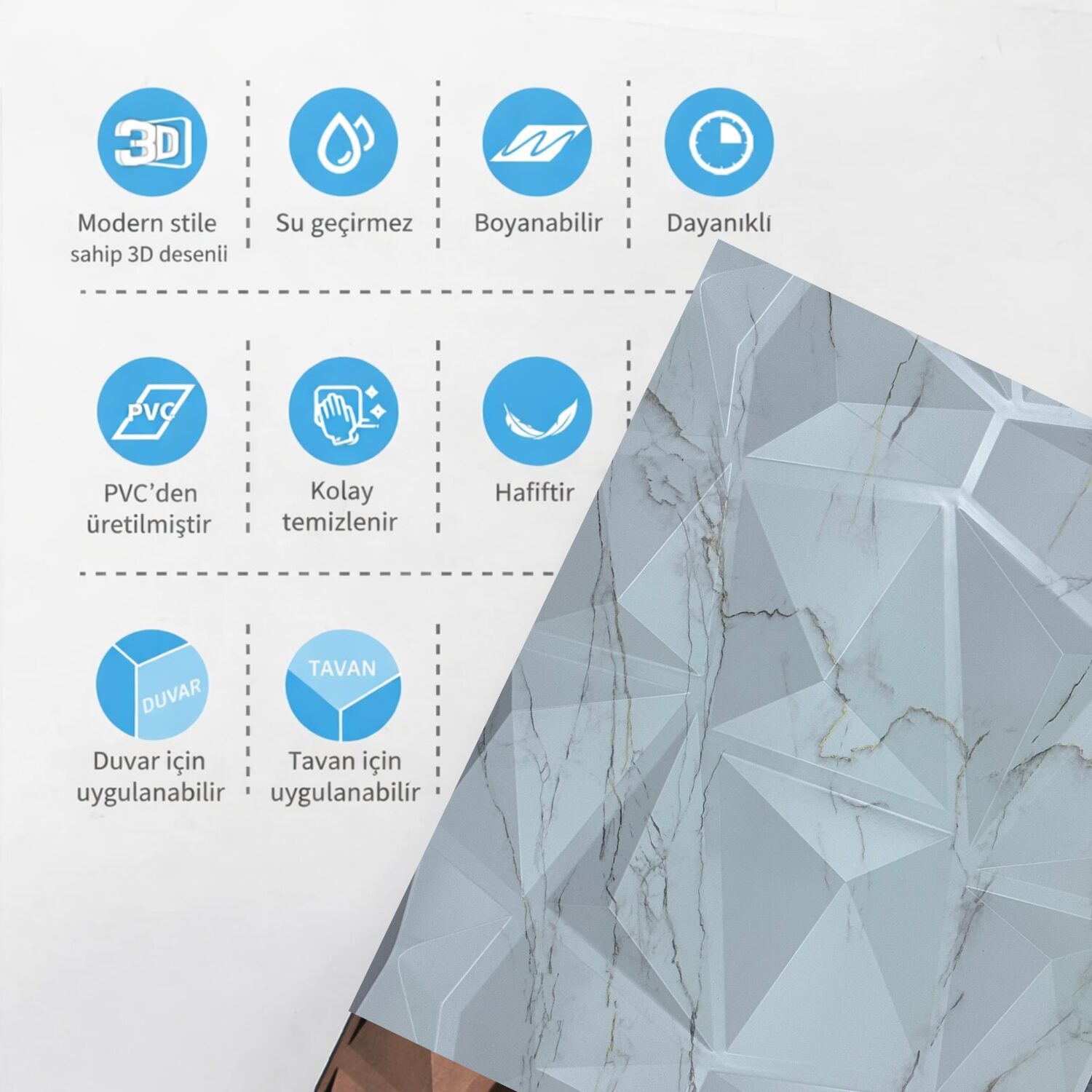 - 3D duvar paneli , iç ve dış mekandaki sıkıcı duvarların görünümünü değiştirmenize olanak tanır; bu ürün, yatak odanızın, mutfağınızın, TV odanızın, duvarların veya tavanların görünümünü değiştirmek için harikadır. Ofisler, kafeler veya restoranlar için harika tasarımlara sahiptir. Kurulum için Deneyim gerekmez; birkaç saat içinde herhangi bir duvarın görünümünü değiştirebilirsiniz. Böylelikle kullandığınız alan zengin görünüme kavuşur.